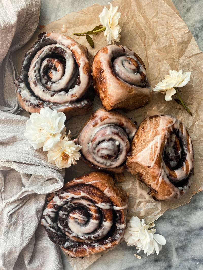 These soft, plush rolls are layered with cinnamon sugar goodness and drizzled with a luscious vanilla glaze. Can you think of anything more cozy to have for breakfast? The sourdough element not only adds a very subtle tang to the dough, but makes these little scrolls more digestible and lower in glycemic index! These do take a bit more time, but in the end, every minute spent making these will be SO worth it. Light, fluffy, rich in flavor. These are a favorite for any holiday or just when you’re craving something sweet, they always hit the spot!
