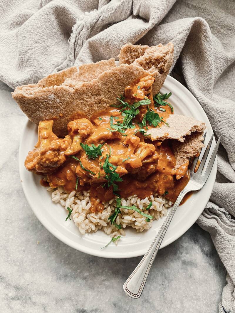 This INDIAN BUTTER CAULIFLOWER is destined to become your new favorite weeknight meal! It’s the perfect bowl of warming comforting food that is simply delicious. This dish is a healthier spin on the traditionally heavier dish made with meat, but still rich and incredibly flavorful. Charred cauliflower made with plenty of spice and creamy coconut milk. Finish off each bowl with fluffy rice and freshly baked naan.